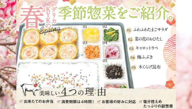 デリカKYKでは、お弁当の副菜を春限定の「春惣菜」に衣替えいたしました。春の訪れを感じる彩り豊かな副菜を取り揃え、お弁当の美味しさをより一層引き立てます。 今回の春惣菜は、やさしい味わいと季節感を大切にしたラインナップです。 【春の副菜ライン... -