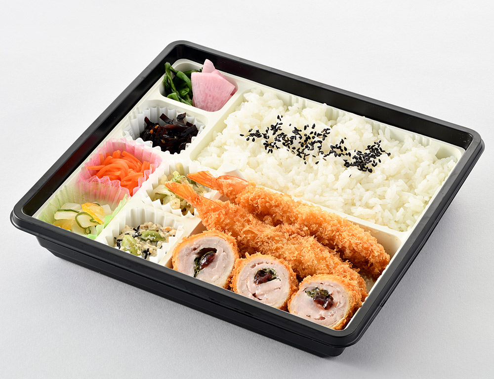 梅しそをフレッシュなロース肉でひとつひとつ丁寧に手巻きした創作とんかつに海老フライ2尾を組み合わせたお弁当です。
